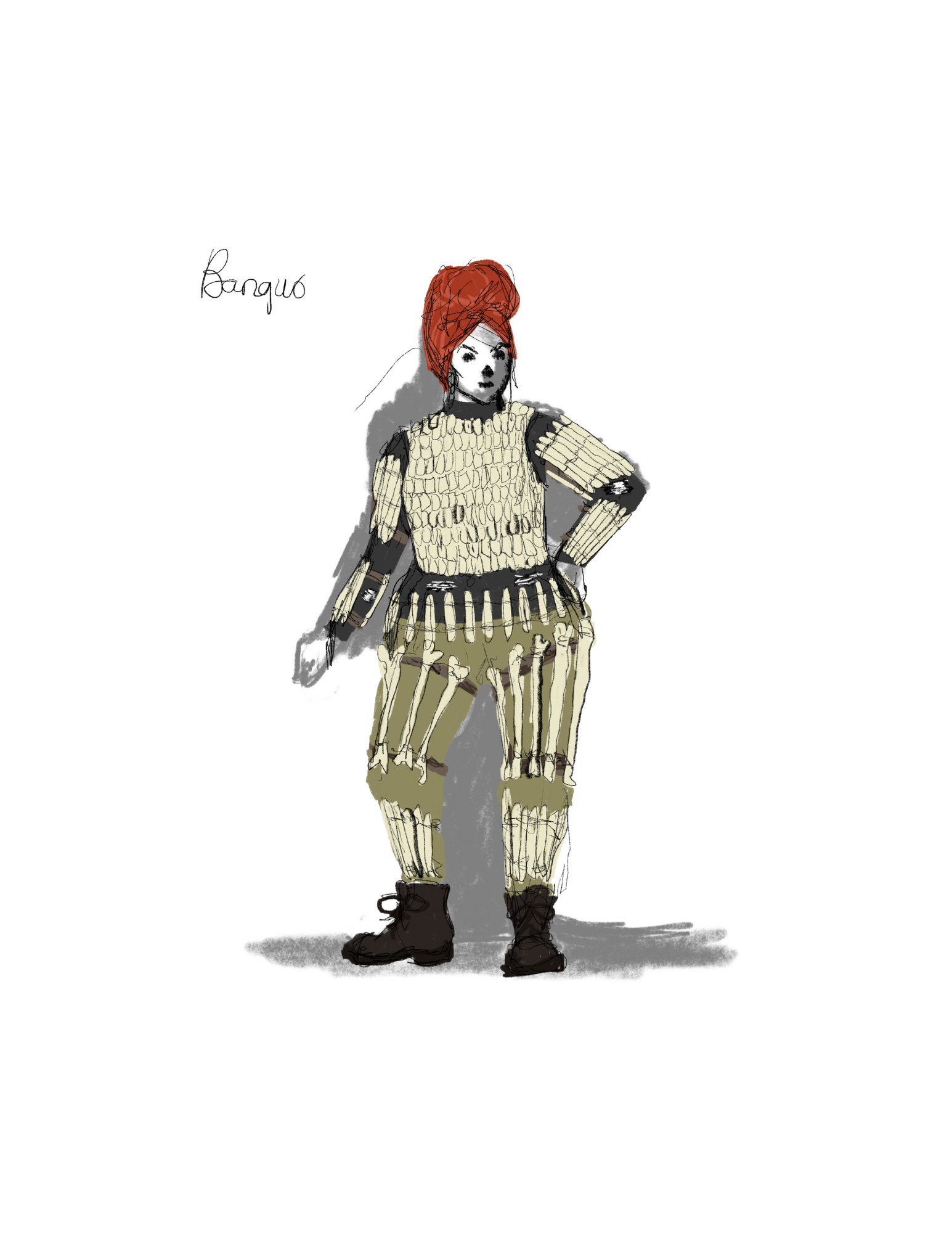 Set in a post-apocalyptic Paris, this reinterpretation of Macbeth imagines a world where a devastating natural disaster has driven the population into the city’s underground catacombs. Struggling for survival and locked in a brutal conflict over scarce resources with a dominant upper class, the story’s characters are armed only with what remains of the past—bones pulled from the very tombs they now inhabit. Drawing inspiration from research on the Paris Catacombs and contemporary Parisian street photography, this design reimagines Shakespeare’s tragedy through a dystopian lens, blending historical remnants with future ruin.